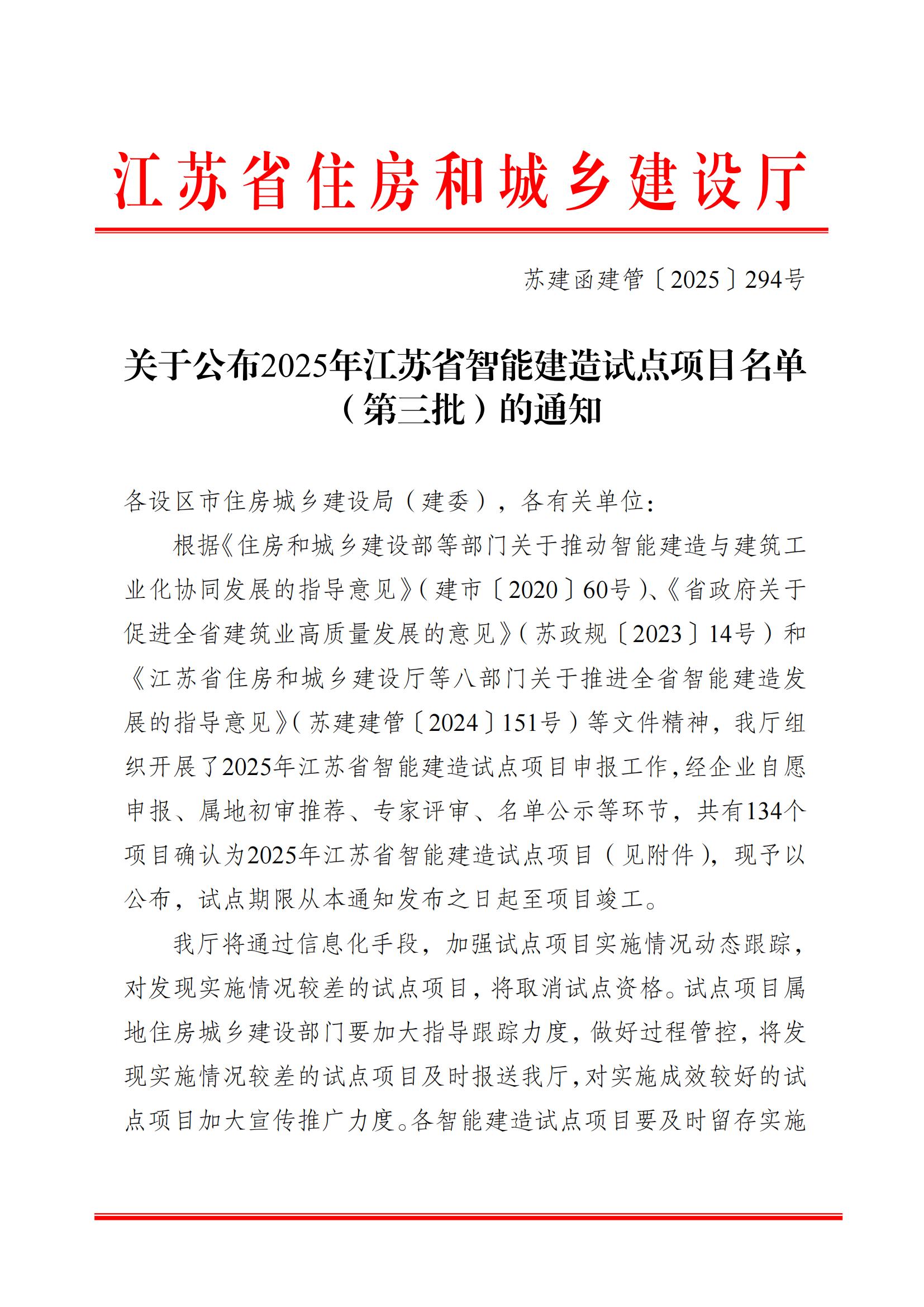 近日,江蘇省住房和城鄉(xiāng)建設(shè)廳正式公布了2025年度江蘇省智能建造試點(diǎn)項(xiàng)目名單(···